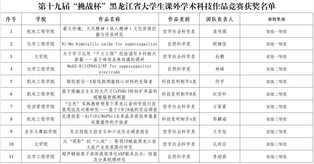 近日,由共青团黑龙江省委员会、黑龙江省科学技术协会、黑龙江省教育厅、黑龙江省科技厅、黑龙江省社会科学院、黑龙江省学生联合会主办的第十九届“挑战杯”黑龙江省大学生课外学术科技作品竞赛终审决赛在东北石油大学落下帷幕。本届“挑战杯”省赛先后吸引了全省67所高校的1万余件作品踊跃参加,经专家评审,共有195件作品进入终审决赛。bat365学子表现优异,在比赛中斩获省级一等奖3项、二等奖4项、三等奖4项,获奖数量创历史新高。