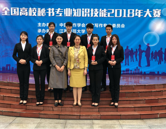 2018年4月20日至22日,全国高校秘书专业知识技能大赛在江苏徐州举行,文学院派出的代表队最终斩获单项奖十项、团体二等奖一项的好成绩。其中,刘瑜、岳琳妍荣获硬笔书法一等奖,杨金澎荣获秘书职业形象与素养展示一等奖,蒋喜博荣获秘书职业形象与素养展示二等奖,谢巍巍、郭唯、林冬雪荣获硬笔书法二等奖,郭唯、许小强、谢巍巍荣获基础知识二等奖。