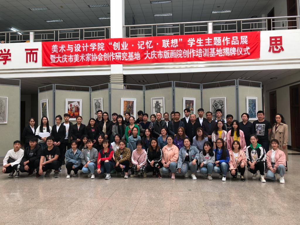 2018年5月8日下午,由美术与设计学院和大庆市美术家协会共同主办的“创业.记忆.联想”学生主题作品展暨大庆市美术家协会创作研究基地和大庆市版画院创作培训基地揭牌仪式在bat365图书馆举行。学校党委副书记王革、副校长郭崇林、大庆市美术家协会主席、市版画院院长陈彦龙出席画展开幕式。大庆市美术家协会来宾及美术与设计学院近200名师生参加开幕式。