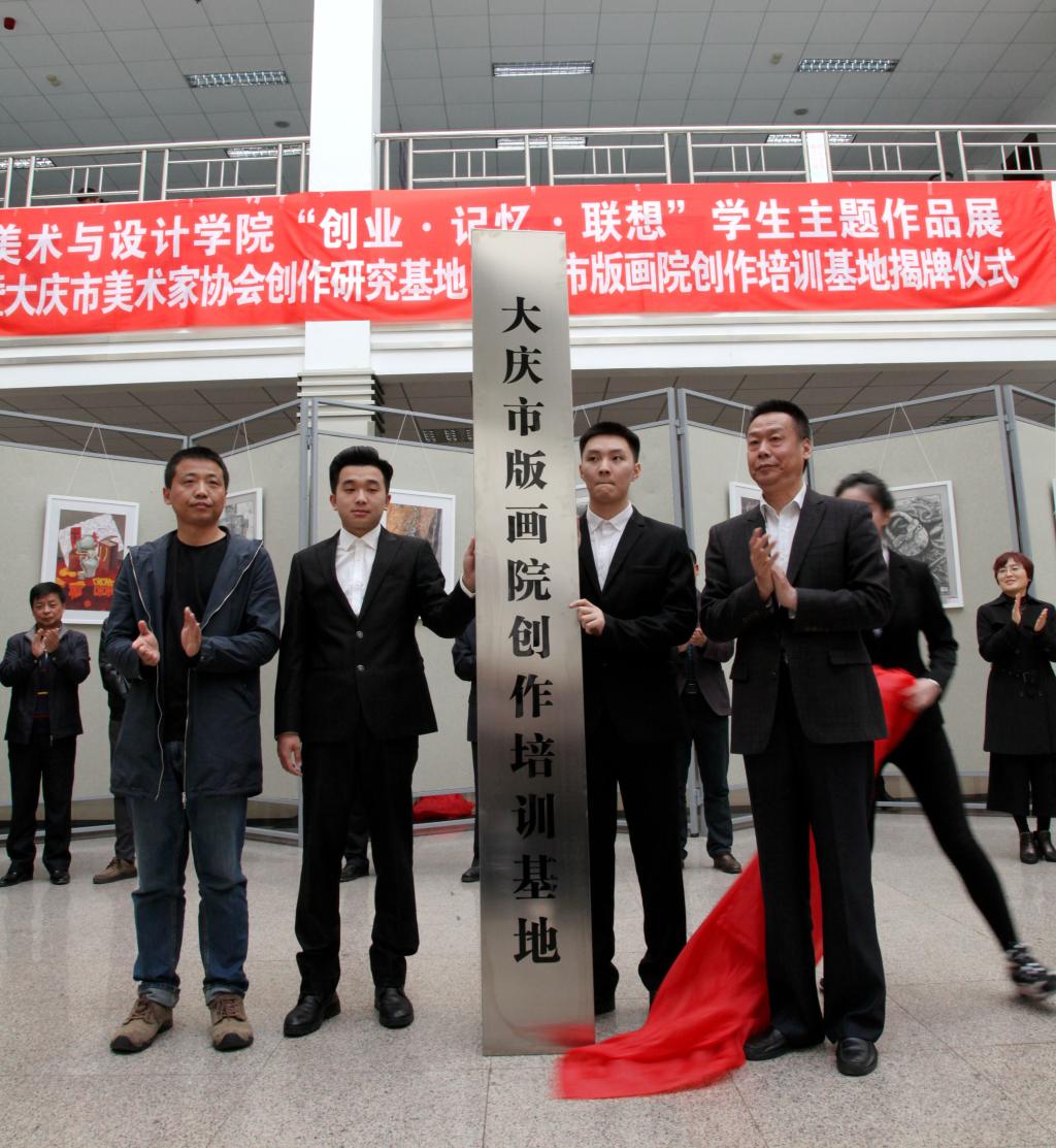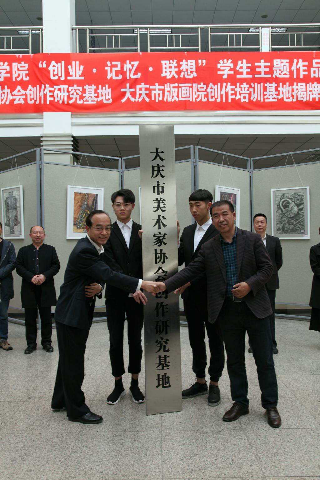 党委副书记王革与市美协主席陈彦龙为“大庆市美术家协会创作研究基地”揭牌,副校长郭崇林与市美协秘书长蔡醒善为”大庆市版画院创作培训基地”揭牌并参观了展览。