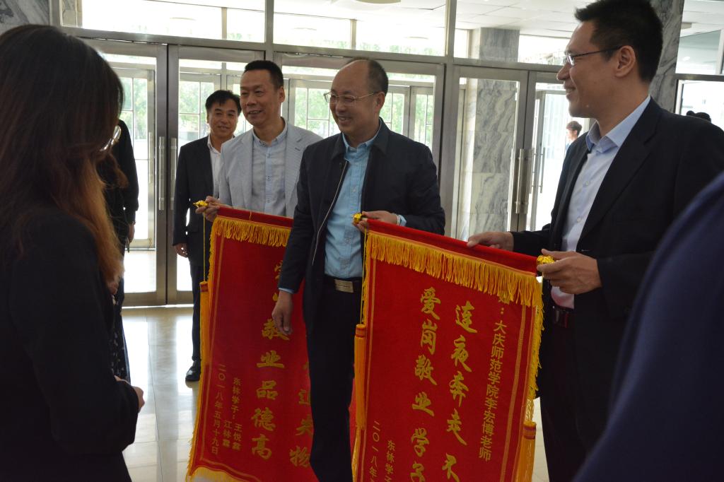 在5月20日颁奖典礼前,省教育厅高教处王跃然处长和乔志和校长代表学校接受了两位同学赠送的锦旗,并转交到盖立庆和李宏博手中。