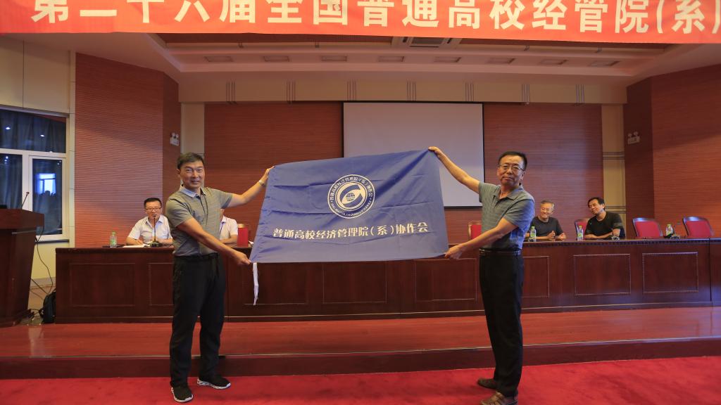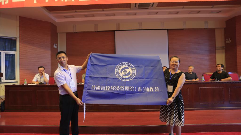 最后,张国旺理事长宣布下一届协作会由海南热带海洋学院海商学院承办,并与bat365官方官网经济管理学院党总支书记孔若东进行了隆重揭旗仪式,本届承办方bat365官方官网经管学院院长张平教授与下一届的主办方海南热带海洋学院海商学院院长鲁晓丽教授进行了会杯和会旗交接。鲁晓丽教授进行了发言,并向与会代表发出来热情洋溢的邀请,邀请各位代表2019年相聚在海南省三亚市。