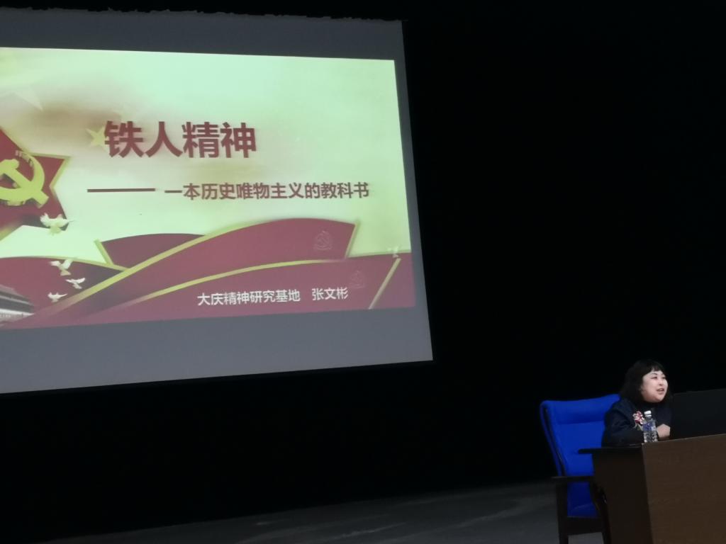 张文彬老师为同学们作了题为《铁人精神——一本历史唯物主义的教科书》的报告。她从苦难铁人、英雄铁人、温情铁人、智慧铁人等方面为大家生动解读了一个热爱工作、热爱生活、热爱人民、乐观坦荡、富有哲学智慧的铁人,让大家对于铁人精神的丰富内涵、当代价值有了更深刻的认识和思考。
