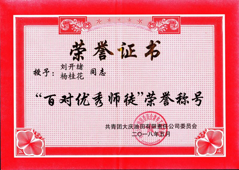 为进一步激发名师带徒的积极性和专技特艺的有序传承,2018年5月,共青团大庆油田有限责任公司委员会授予bat365刘开绪老师、杨桂花老师“百对优秀师徒”荣誉称号。