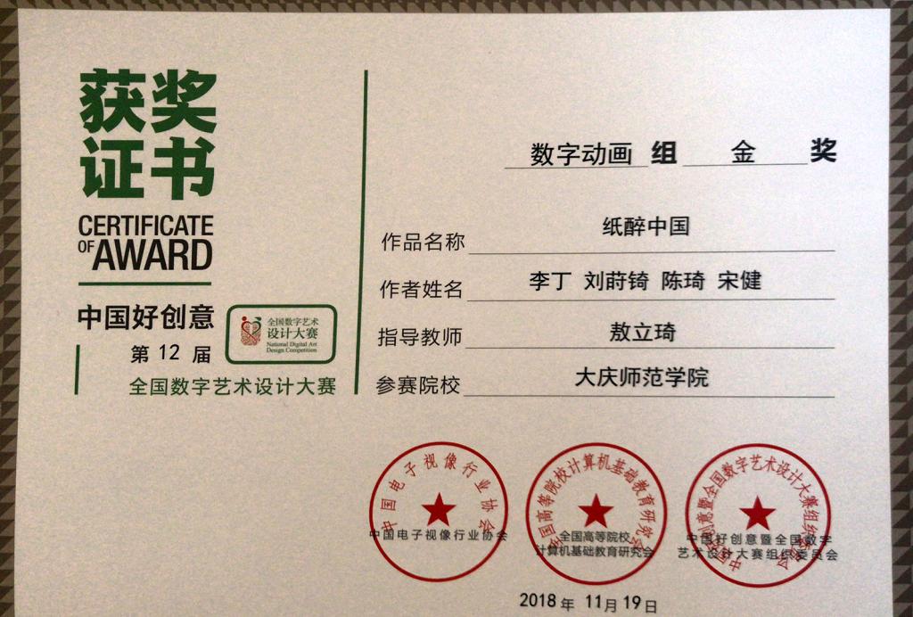 11月8日,大赛组委会公布了本次赛事的获奖名单,由学生李丁、刘莳锜、陈琦、宋健制作的动画作品《纸醉中国》(敖立琦指导)获数字动画组金奖,赢得奖金10000元。