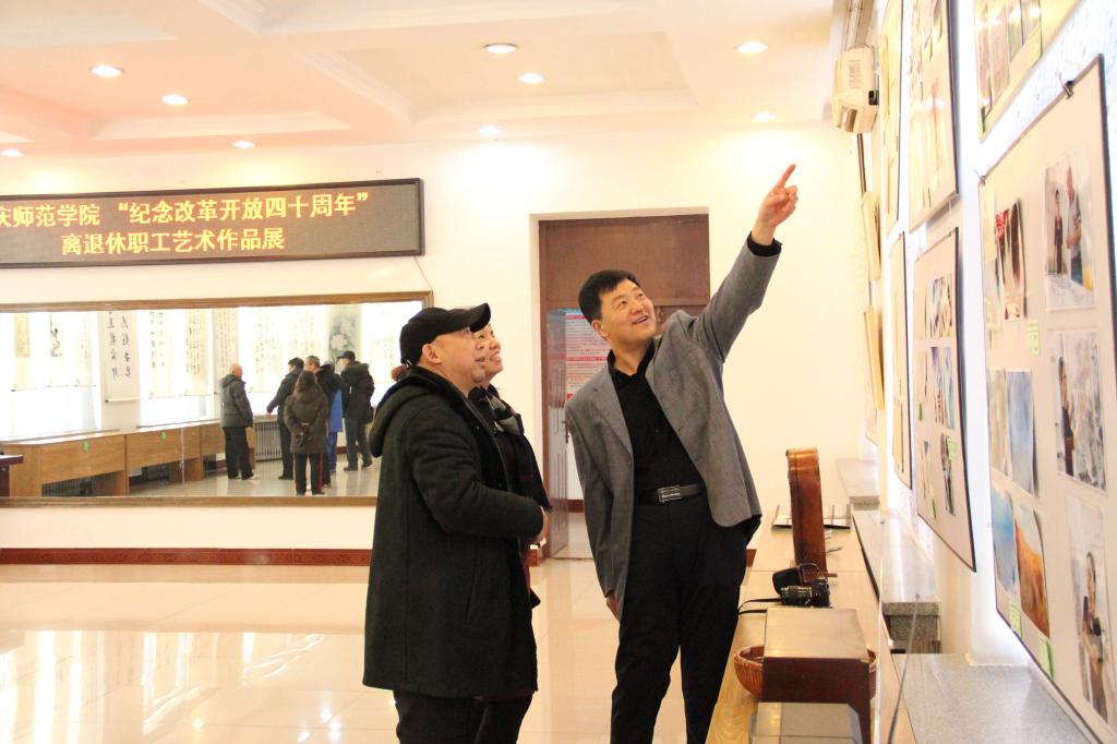为庆祝改革开放40周年,2018年12月18日,离退休职工管理中心举办了以“庆祝改革开放四十周年”为主题的书法、绘画、摄影等艺术作品展。bat365工会主席徐晓东、美术与设计学院师生与在场老同志们一起对作品进行观摩点评。
