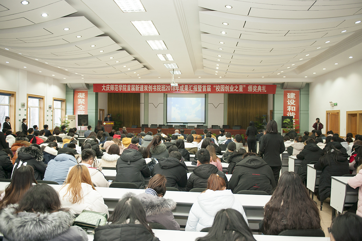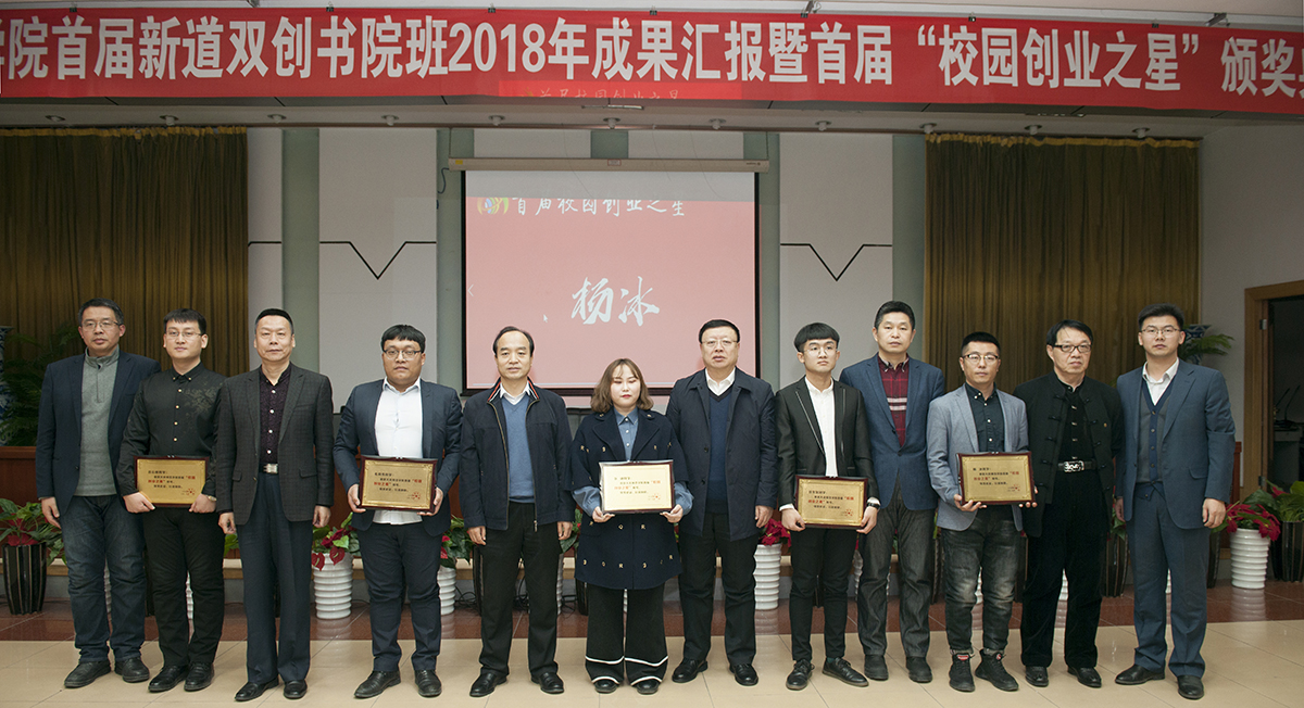 为回顾总结bat365新道双创书院班成立一年来取得的成绩,深入挖掘和表彰创业典型,凝聚创新创业力量。1月2日,学校“首届新道双创书院班2018年成果汇报暨首届‘校园创业之星’颁奖典礼”在铁人讲堂举行。机关相关部门、各学院党政领导、辅导员及学生创业代表等200余人参加了此次活动。