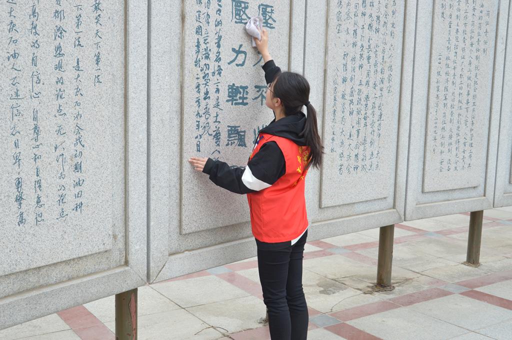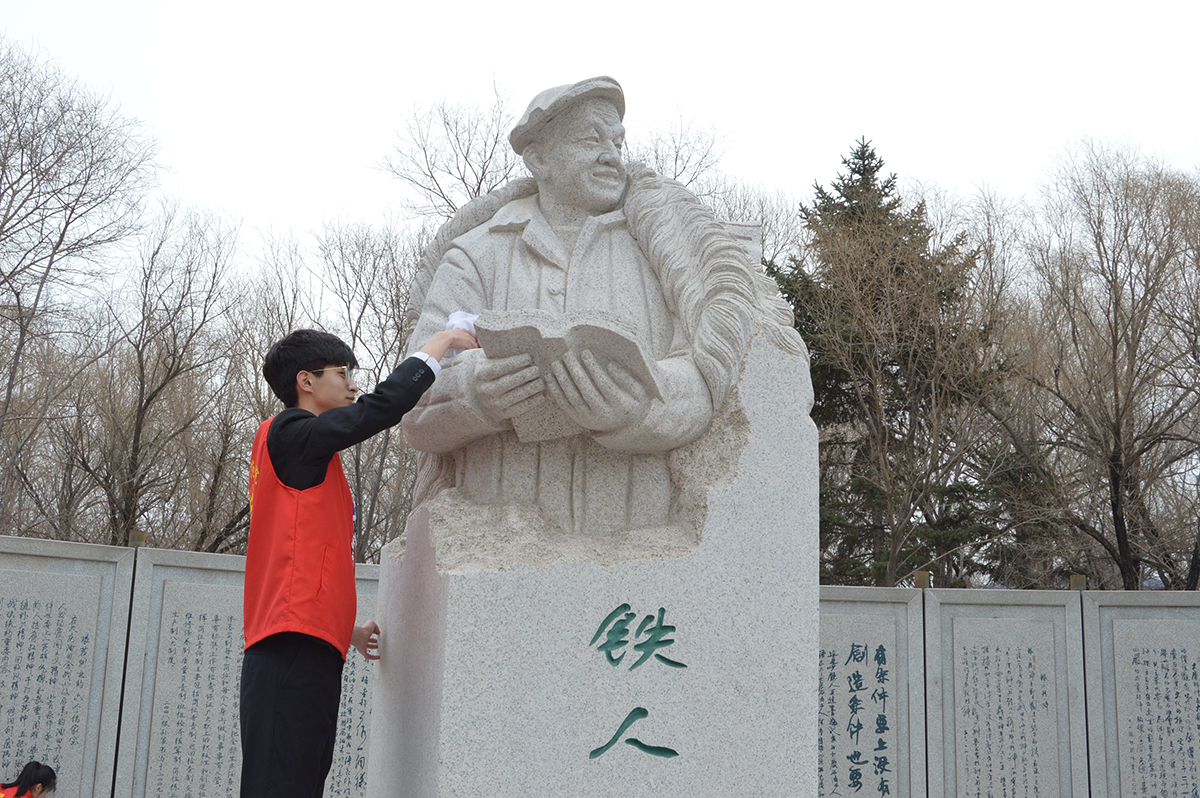 祭扫活动结束后,同学们自发对石油碑林清扫地面,擦拭铁人塑像。
