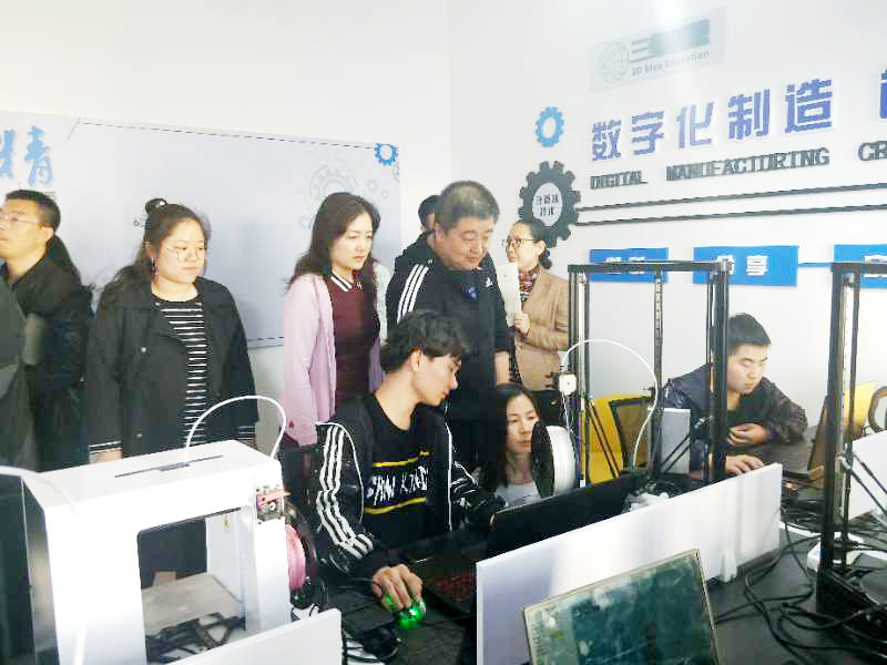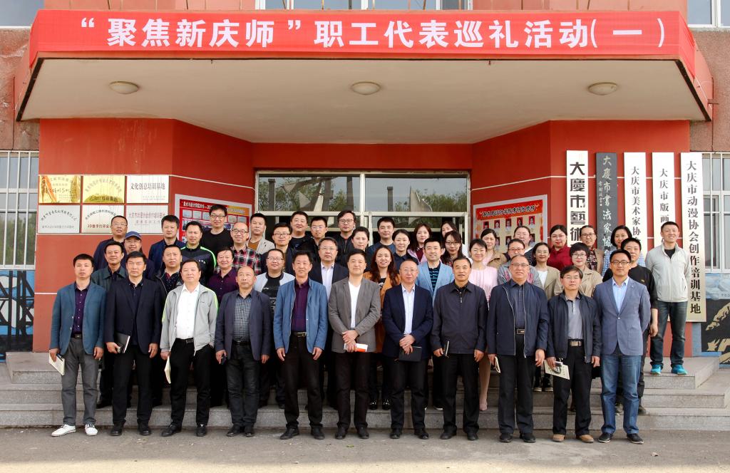 教职工代表考察了学校转型试点单位美术与设计学院。在图书馆,美术与设计学院工会主席孙琦带领职工代表考察了学生毕业设计成果展、美术教师石油工业主题作品陈列展、大庆油陶陈列室;在美术与设计学院教学楼参观了分画室和石油工业墙绘等;在美术与设计学院实训楼,张立翔老师带领职工代表考察了4个校企共建实训室,教师、学生作品陈列室;在陆津老师的带领下,职工代表考察了乐淘坊、商鲲3D打印实训室、银家工坊、初阳手绘工作室等5家校企共建实训室。