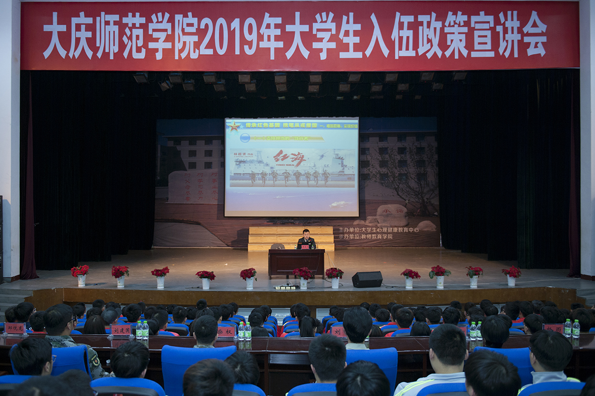 5月22日下午,2019年大学生入伍政策宣讲会在大学生活动中心举行,副校长刘恒,大庆市军分区动员处处长柴权以及全校900余名师生参加了本次宣讲会。