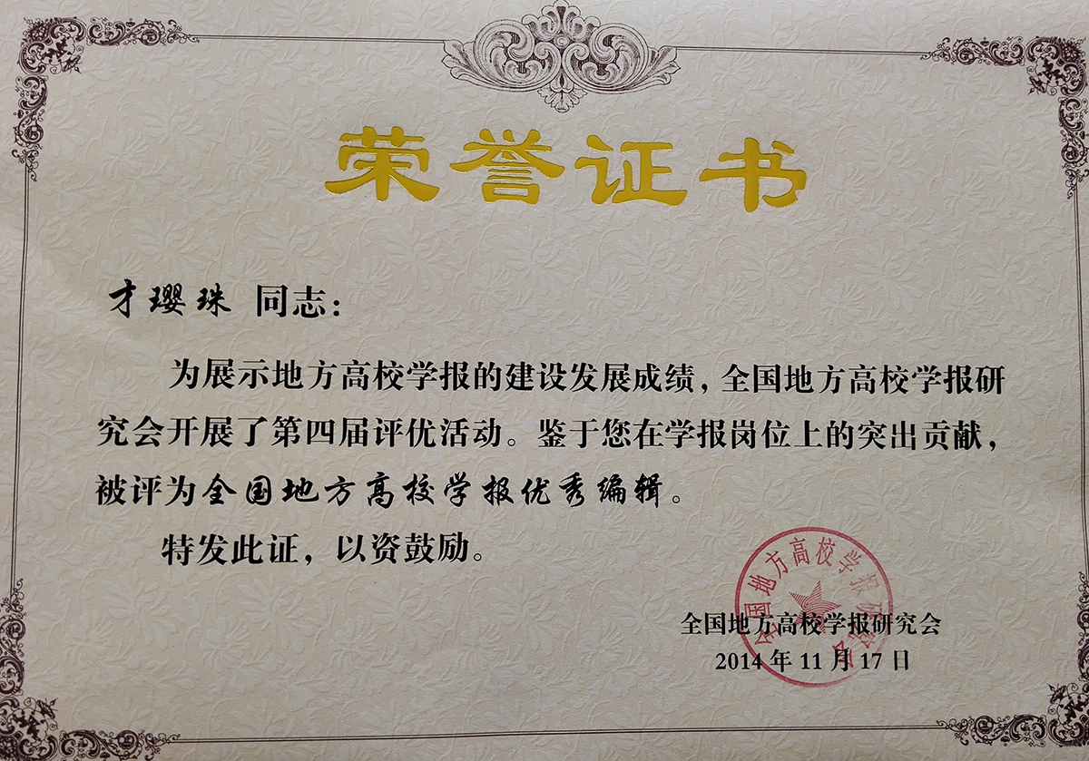为了展示2010年以来地方高校学报的建设发展成绩,全国地方高校学报研究会开展了第四届评优活动。《bat365官方官网学报》以其所刊载的文章内容健康向上,学术品位、应用价值、文化价值较高,学术影响力较强,语言文字规范,编校质量好,在内容和风格上具有自己的特色而从众多地方高校学报中脱颖而出,被评为“全国地方高校优秀期刊”。同时,才璎珠编辑被评为全国地方高校学报优秀编辑。