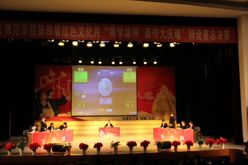 2014年11月6日晚,在大学生活动中心举行了第四届红色文化月活动“博学雄辩薪传大庆魂”辩论赛总决赛。校党委副书记王革、校党委副书记刘恒、法学院院长丁启明、党委学工部部长郭春满以及12个院系的党总支书记、学生党支部书记莅临了本次辩论赛。