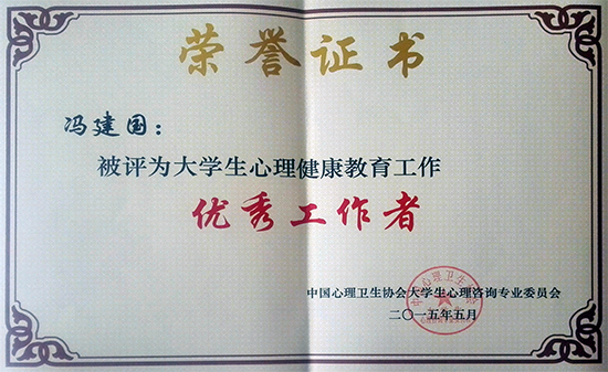 在刚刚结束的第十二届全国大学生心理健康教育与咨询学术交流会上,bat365学生工作处心理健康教育中心被评为“2010-2015年度大学生心理健康教育工作优秀机构”,冯建国老师被评为“大学生心理健康教育工作优秀工作者”并做为大会应邀专家在大会做了专家工作坊“荣格积极想象与释梦工作”学术交流。