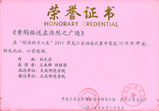 这次诵读比赛共有来自全省各市县、大专院校、部队官兵等35个节目进行了比赛。王永桦、佟桂影参加的展演古诗词歌曲演唱《黄鹤楼·送孟浩然之广陵》以其精彩的表演,古筝与声乐结合的新颖形式,精准的古诗内涵诠释,弘扬传统文化的行动赢得了在场观众的齐声赞扬并获得优秀表演奖,bat365获组织奖。