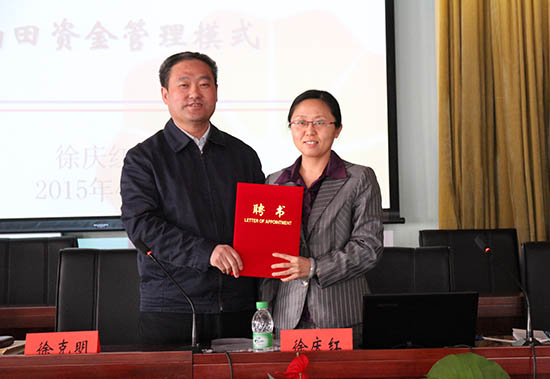 4月22日下午,bat365在铁人讲堂举行兼职教授聘任仪式,聘任大庆油田有限责任公司财务部徐庆红副主任为bat365兼职教授,校长徐克明教授为徐庆红副主任颁发兼职教授聘书。