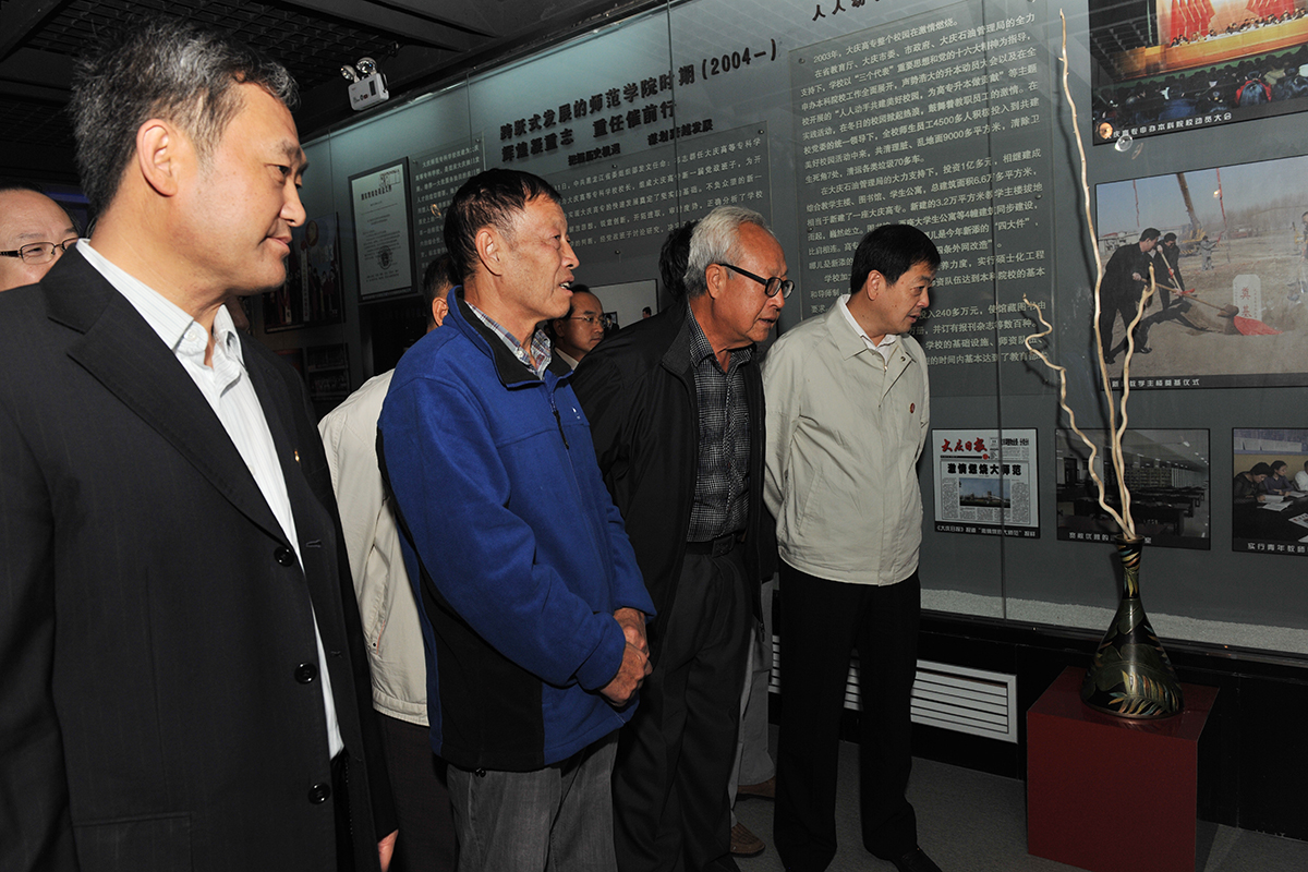 在校史馆展厅,大庆油田党委常委、大庆油田有限责任公司副总经理、大庆石油管理局副局长、大庆钻探工程公司总经理、学校党委书记钟启刚,校长徐克明与老领导们一一握手,互致问候。在校史展板前,钟启刚书记认真观看着学校发展的历史缩影,不时与学校老领导、在任领导亲切交流学校未来发展的意见。