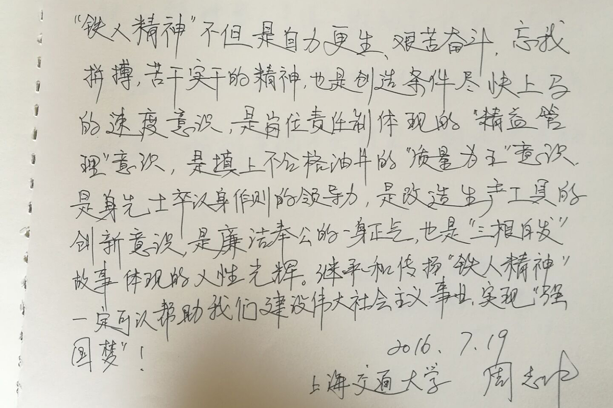 两天来,由上海交通大学、华东师范大学、上海财经大学、上海大学、上海中医药大学、上海海关学院等上海多个知名高校组成的哲学社会科学教学科研骨干研修班在铁人一口井、铁人王进喜纪念馆等教学点的考察学习非常认真,参观结束后,华东师大经管学部的蒋旭老师即兴写下一首诗“筚路蓝缕启山林,栉风沐雨砥砺行。大庆之行感悟深,铁人精神耀古今。”