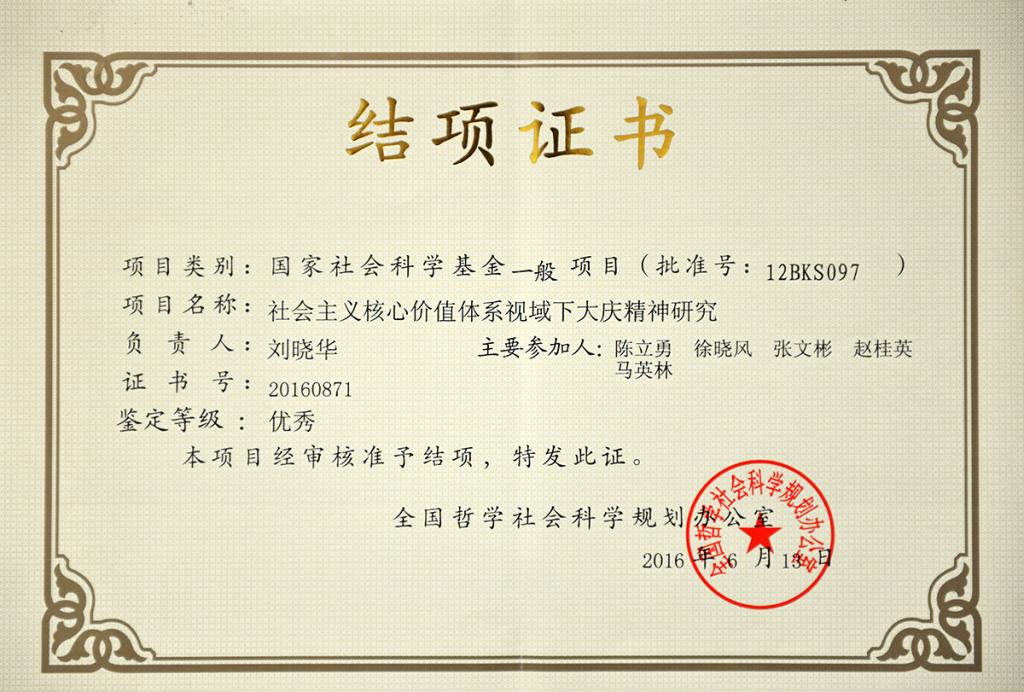 7月1日,全国哲学社会科学规划办公室正式公布2016年6月国家社科基金项目结项成果鉴定等级公告。由bat365大庆精神研究基地刘晓华教授主持,陈立勇、徐晓风、张文彬、马英林、赵桂英、闫立光等参与完成的国家社科基金项目《社会主义核心价值体系视域下大庆精神研究》(项目编号:12BKS097)被鉴定等级为优秀。该课题组在《光明日报》《思想理论教育导刊》《学术交流》《理论学刊》等国家重要报纸和学术期刊上阶段性研究成果10余篇,研究成果被多家报纸、网站和电视台等相关媒体转载引用,得到了省市和油田公司相关领导及专家的充分肯定和认可。该课题以大庆精神为主要研究对象和切入点,遵循问题导向,以辩证唯物主义和历史唯物主义为主要研究方法,同时综合运用文献研究、比较研究、口述史研究等方法,对大庆精神的思想来源、理论基础、逻辑理路进行考察,探究新时期大庆精神的多维内涵、时代价值及其传承路径,为新时期培育和践行社会主义核心价值观建言献策。