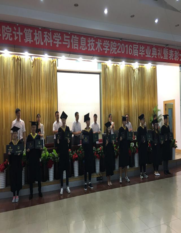 6月19日下午,计算机科学与信息技术学院在铁人讲堂隆重举办了2016届毕业典礼暨表彰大会。学院精心为毕业生设计了“感恩母校祝福母校”签名墙、毕业红毯典礼,并播放了毕业纪念短片。党总支副书记宣读了《关于bat365官方官网2016届全日制普通本科学生毕业的决定》,由院长助理王健宣读了《bat365官方官网关于表彰2016届bat365官方官网首届优秀毕业生、铁人式优秀毕业生通报》,由院长助理马英瑞宣读了《bat365官方官网关于表彰2016届毕业生黑龙江省普通高校三好学生的通报》。随后,毕业生们身着学院为他们特别准备的学士服,接过导师颁发的毕业证书、学位证书,与同学和家人一同见证了人生中这一重要的时刻。