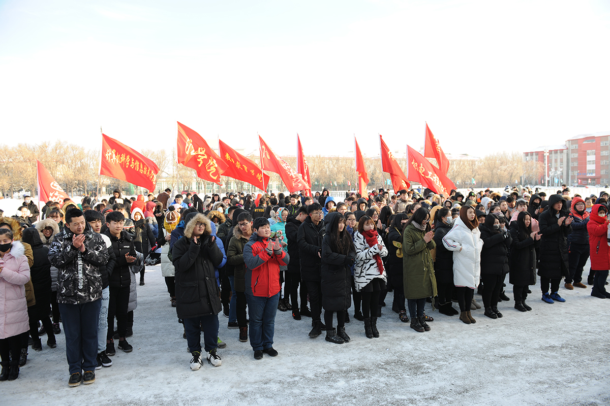 开幕式上,副校长乔志和向冰上运动会致辞,党委副书记刘恒鸣响比赛第一枪。