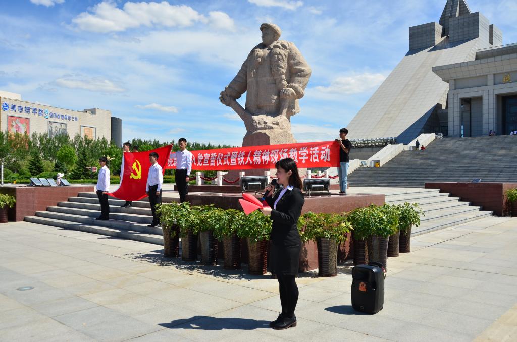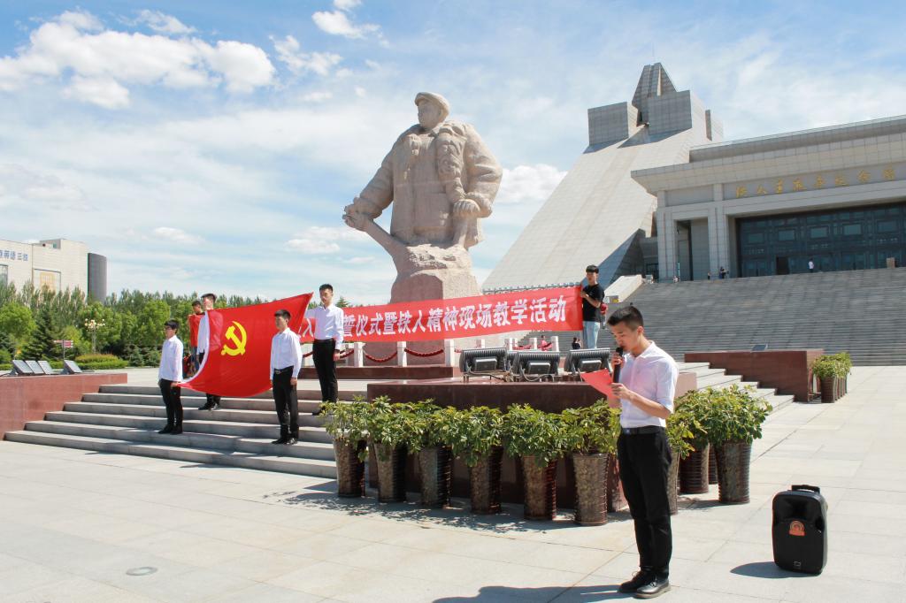 在铁人雕像前,125名新党员面对党旗,紧握右拳,向党庄严宣誓,一句句铿锵的誓言在铁人纪念馆上空回荡。
