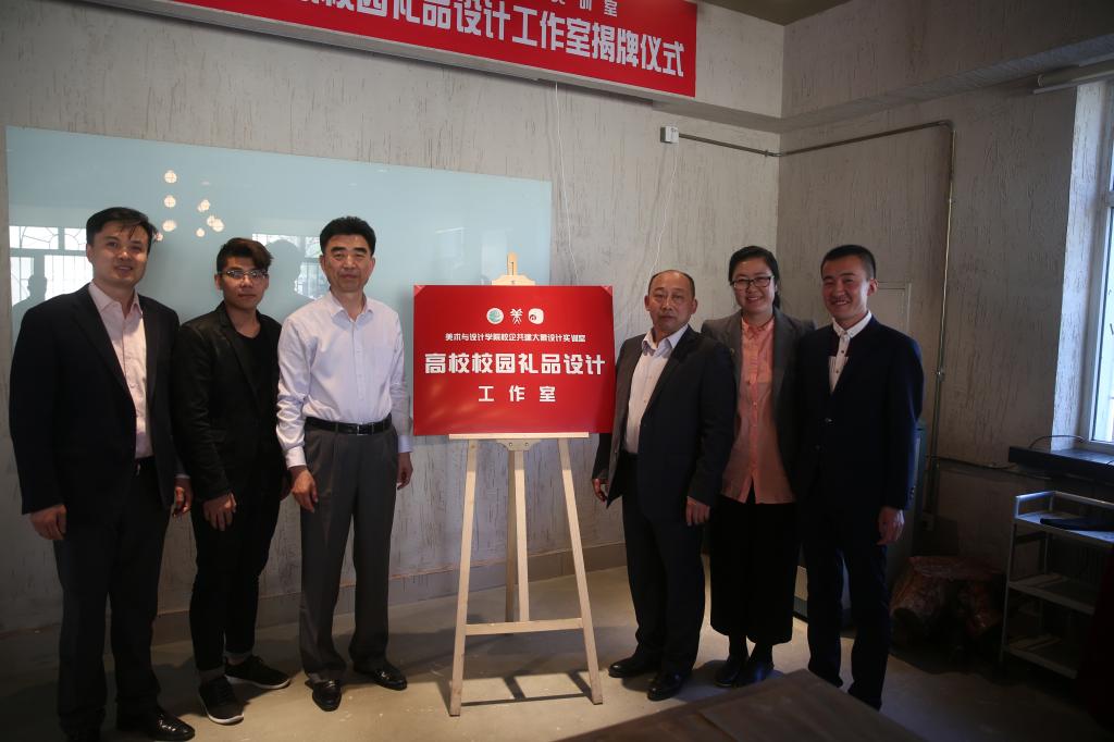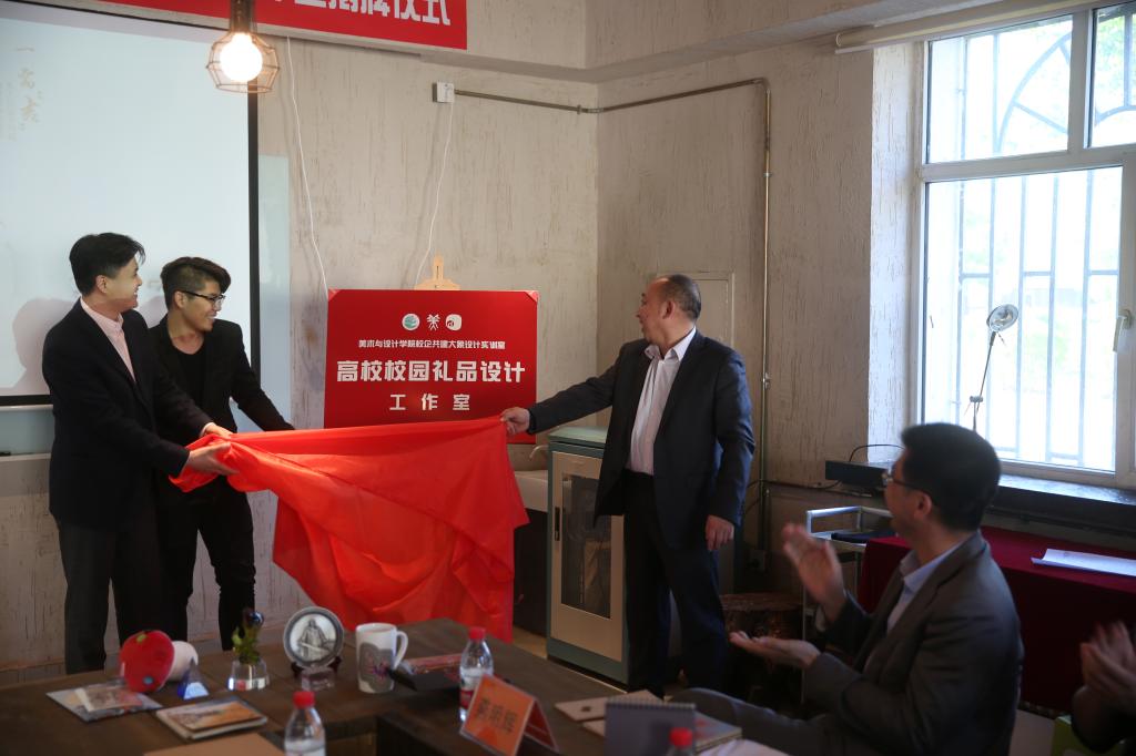 最后,美术与设计学院院长孙大力、大象设计实训室导师贾正超、高校校园礼品设计工作室负责人白岩松共同为工作室揭牌。