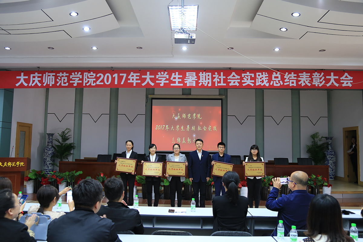 通过视频展播回顾了今年暑期社会实践的开展情况后,团委楚丽丽老师宣读了《关于表彰2017年大学生暑期社会实践先进集体、先进个人的通报》,对优秀组织单位、优秀团队、优秀指导教师和先进个人进行了表彰。优秀组织单位代表教师教育学院、优秀团队代表文学院铁人团队和计算机科学与信息技术学院先进个人代表分别结合实际经历谈感受、谈认识、谈体会。最后团委副书记张雷代表团委对暑期社会实践活动进行了全面总结。