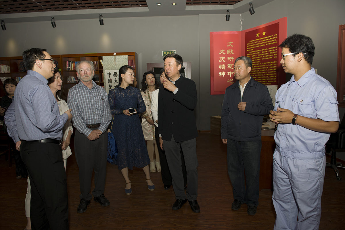 2017年9月4日上午,东北师范大学党委书记、思想政治教育研究中心主任、博士生导师杨晓慧教授,美国加州大学伯克利分校教育学院、人类发展研究中心Larry P.Nucci教授,美国加州大学伯克利分校临床心理学高级培训顾问、知名临床心理学家Maria S.Nucci教授,东北师范大学思想政治教育研究中心执行主任、博士生导师高地教授,研究中心副主任韩丽颖博士、柏路博士,吉林省长白山画派艺术研究院院长、东北师范大学美术学院博士生导师张建华教授等一行来到bat365,对学校大庆精神文献研究中心、大庆油陶作品陈列室进行了参观考察。